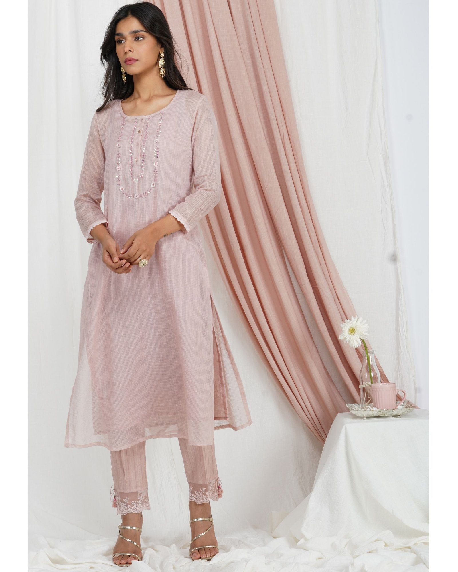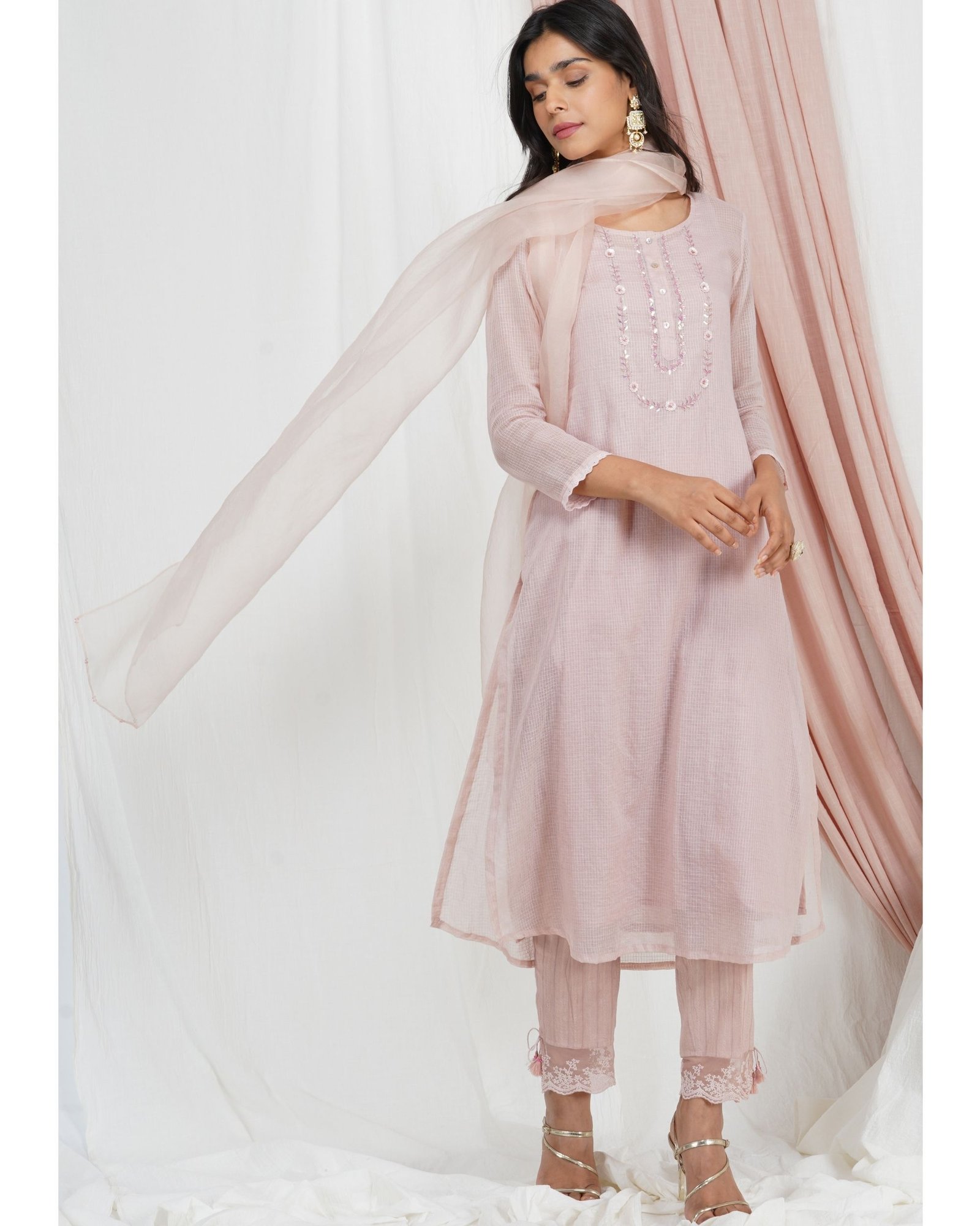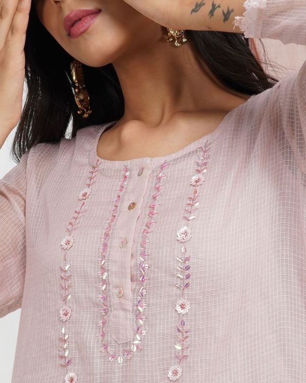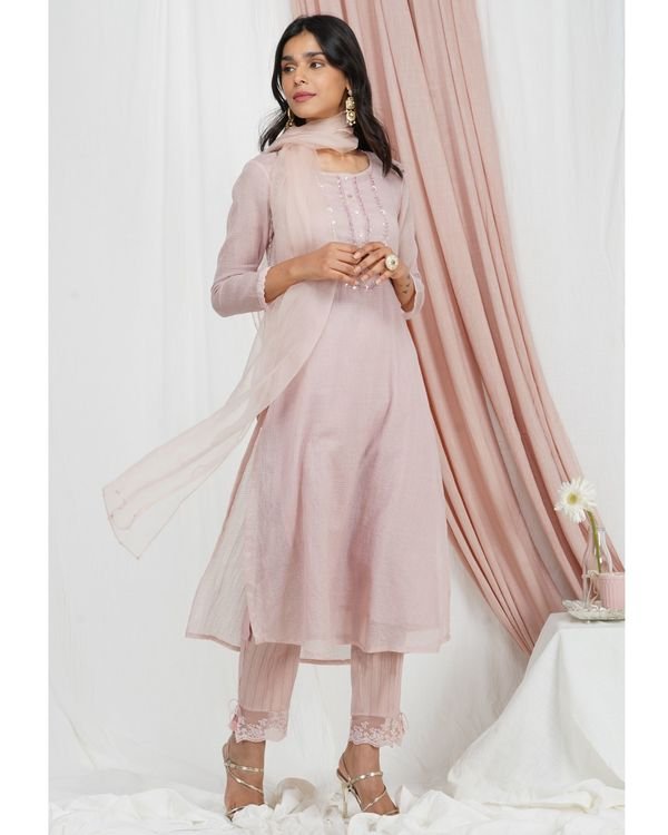 Solid Dusty Pink base with delicate Tone-on-tone Embroidery motifs |