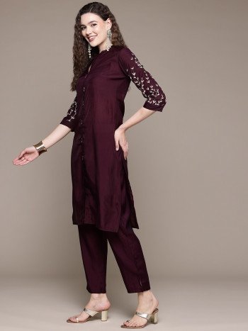 Deep Wine Minimal Embroidered Straight Kurta Set