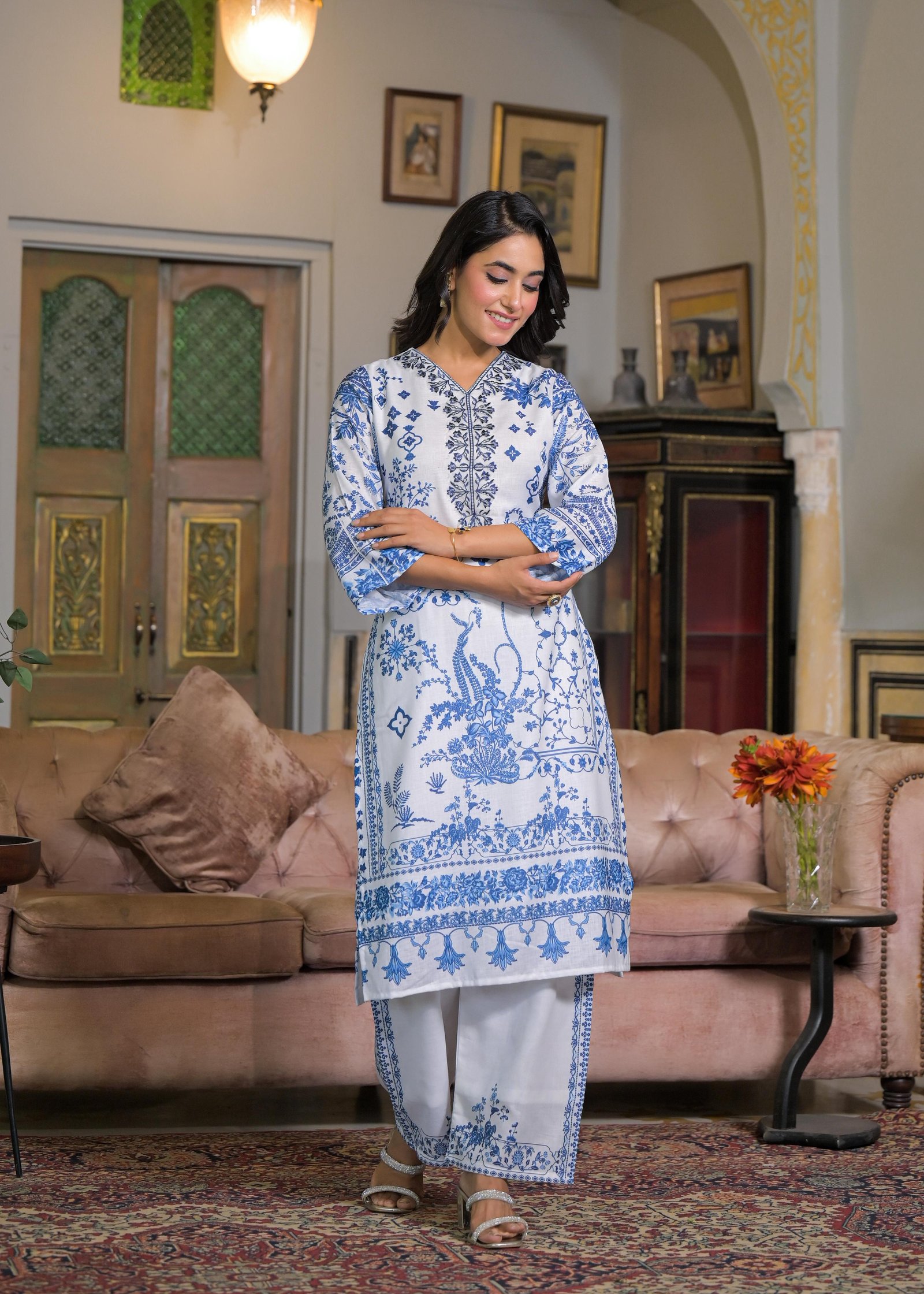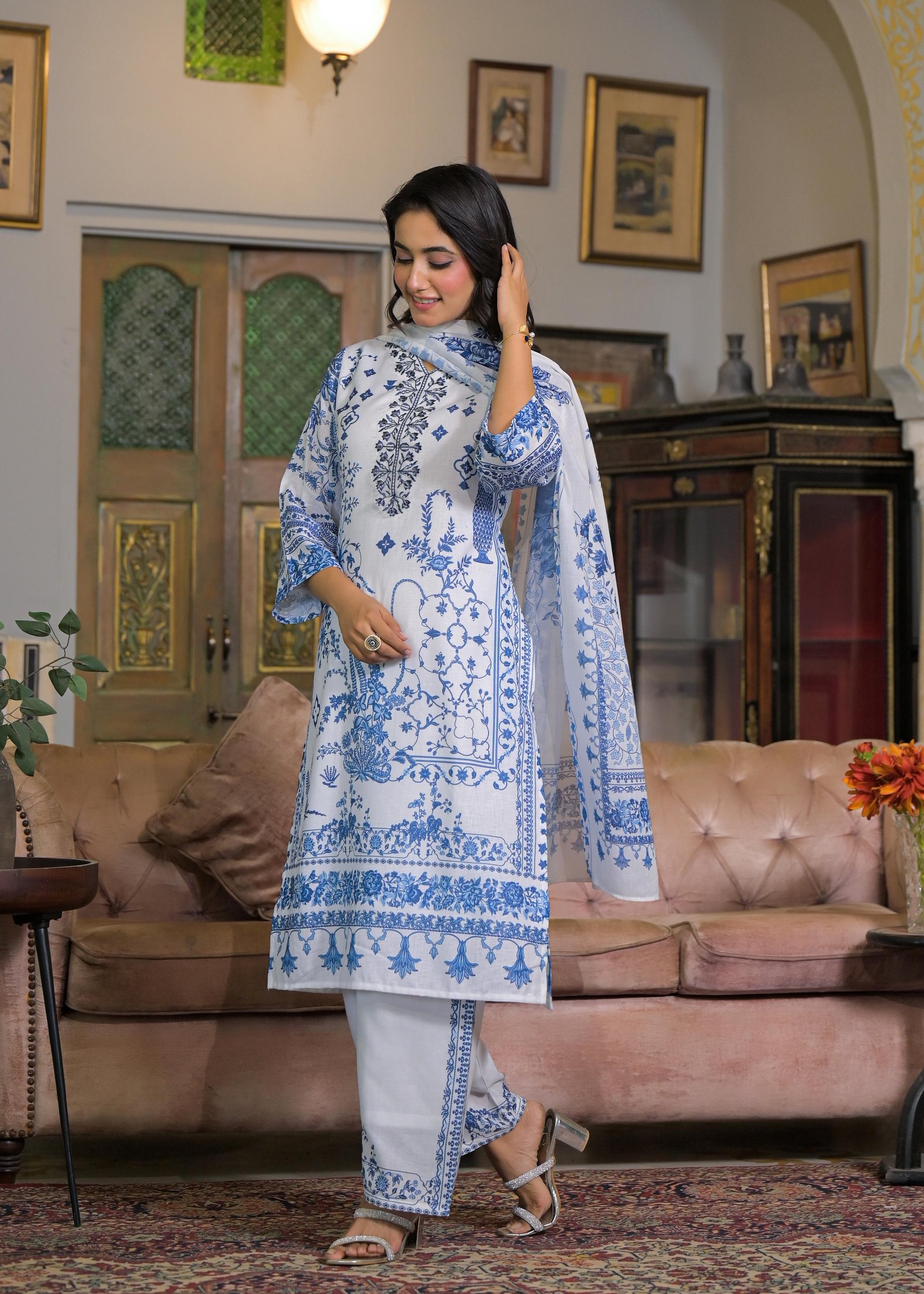 Serene White & Blue Floral Printed Suit Set